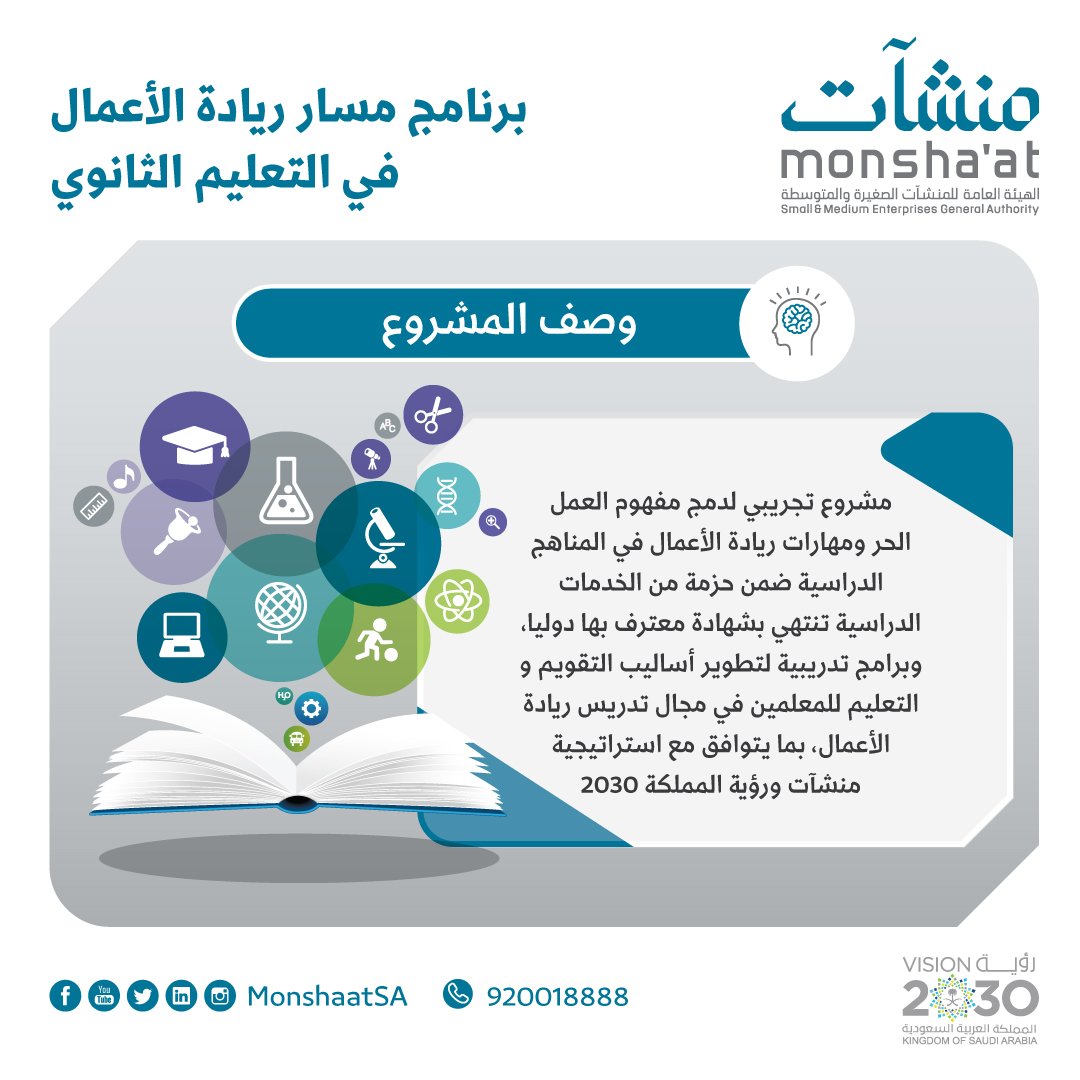 تطوير برنامج وطني لريادة الأعمال و تنمية المشروعات الصغيرة و المتوسطة. ويرجع الاهتمام بريادة الأعمال ليس فقط إلى. أ ب ت ياسر المري 2013 ريادة الأعمال الصغيرة والمتوسطة ودورها في الحد من البطالة في المملكة العربية السعودية السعودية. نشر ثقافة العمل الحر بين أفراد المجتمع و بناء سلوك ايجابي نحو ممارسته.